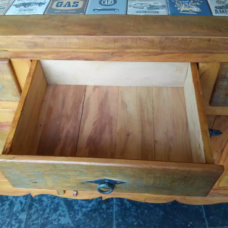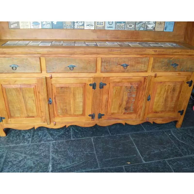 Este móvel é feito com madeira de demolição, portanto podem ter ranhuras ou marcas de prego típico do produto.
