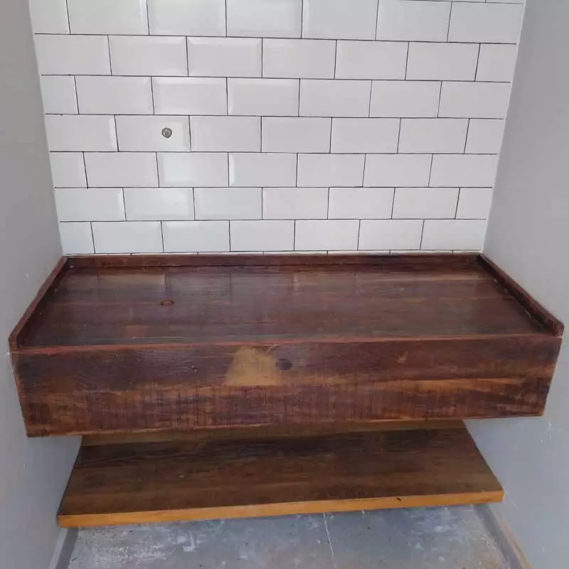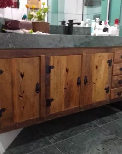 Este móvel é feito com madeira de demolição, portanto podem ter ranhuras ou marcas de prego típico do produto.