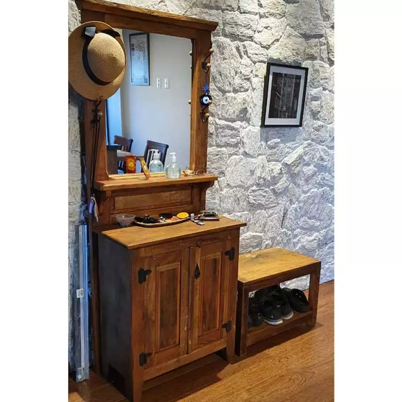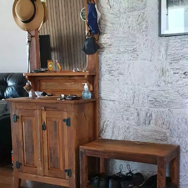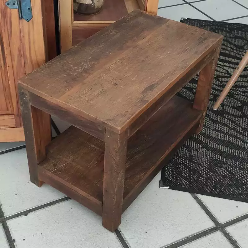 Este móvel é feito com madeira de demolição, portanto podem ter ranhuras ou marcas de prego típico do produto.