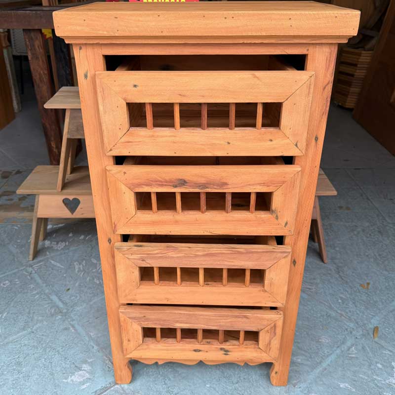 Este móvel é feito com madeira de demolição, portanto podem ter ranhuras ou marcas de prego típico do produto.