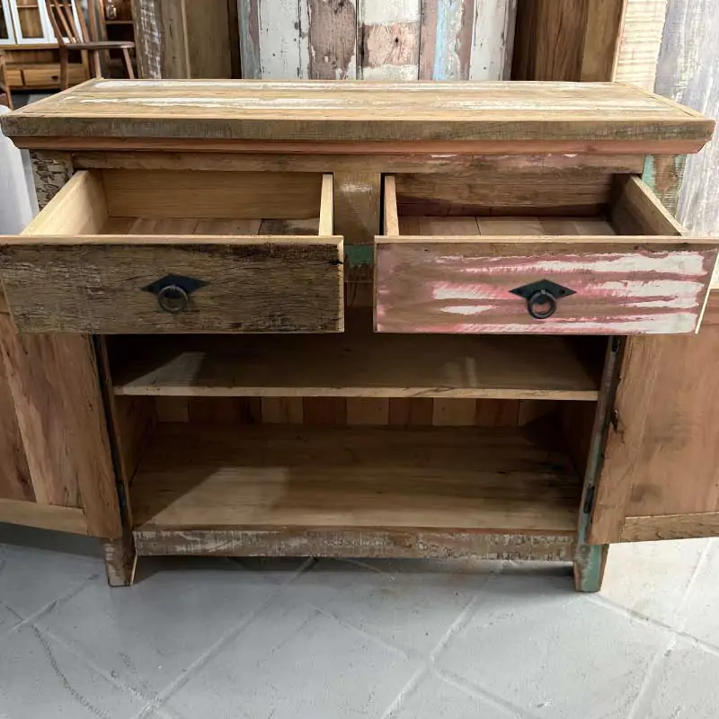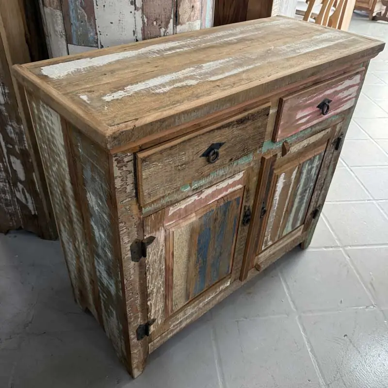 Este móvel é feito com madeira de demolição, portanto podem ter ranhuras ou marcas de prego típico do produto.