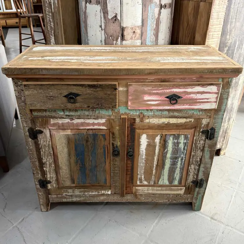Este móvel é feito com madeira de demolição, portanto podem ter ranhuras ou marcas de prego típico do produto.