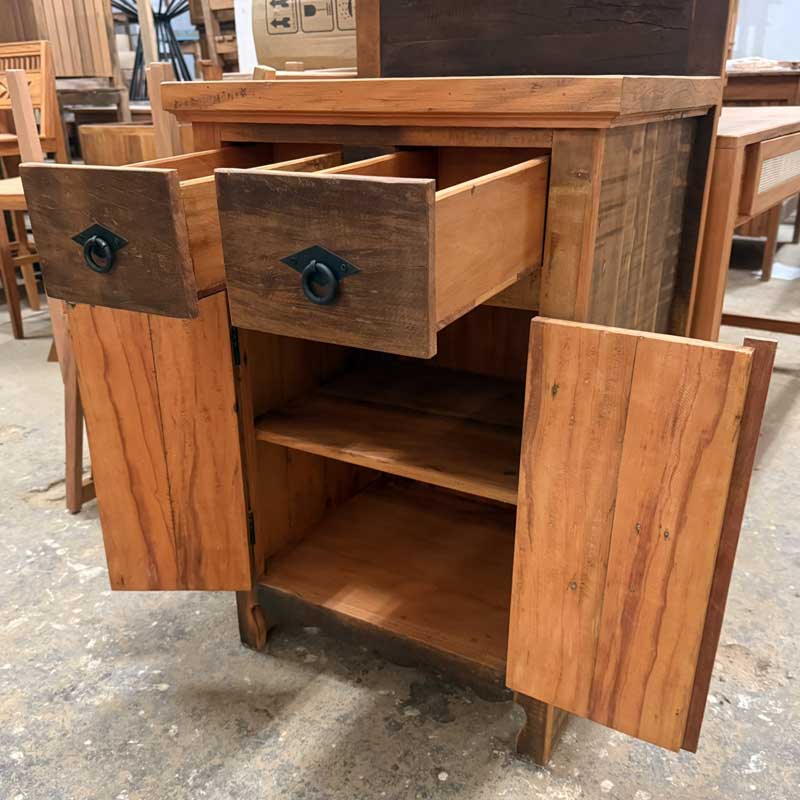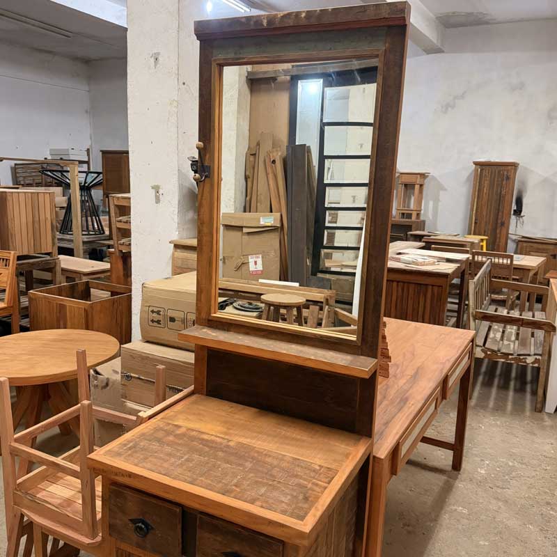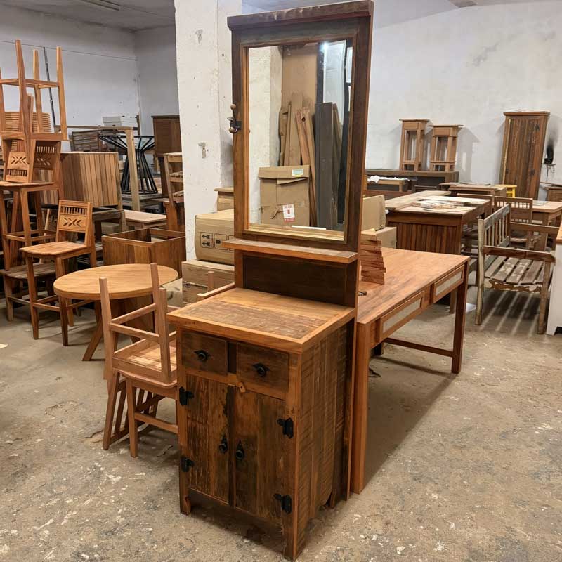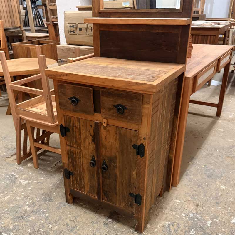 Este móvel é feito com madeira de demolição, portanto podem ter ranhuras ou marcas de prego típico do produto.
