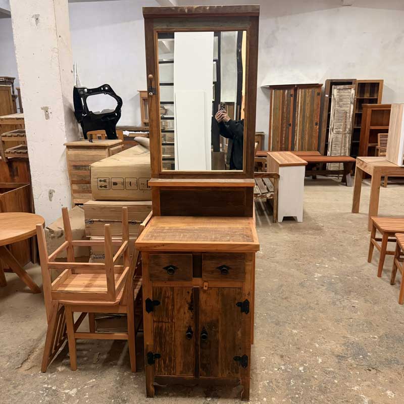 Este móvel é feito com madeira de demolição, portanto podem ter ranhuras ou marcas de prego típico do produto.