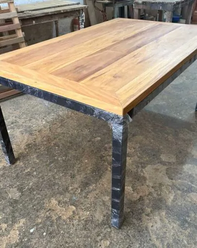 • MESA COM O TAMPO DE PEROBA ROSA COM O PÉ DE FERRO PINTURA ELETROSTÁTICA