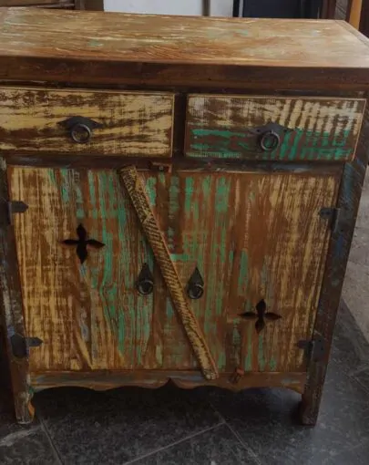 Este móvel é feito com madeira de demolição, portanto podem ter ranhuras ou marcas de prego típico do produto.